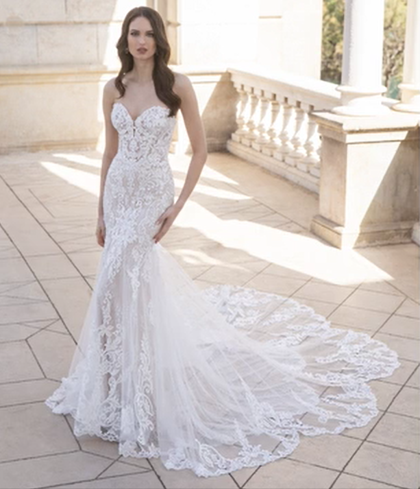 Vælger du denne kjole kan du få den med hjem på dagen hvis du ønsker dette. Denne kjole kan ikke bestilles fra ny, og du vil derved købe en prøvemodel fra butikken. Der vil altid være risiko for løse tråde, blonder, perler og minimale huller, der ikke har betydning for kjolens design. Inden kjolen forlader butikken vil vi sammen gennemgå kjolen
