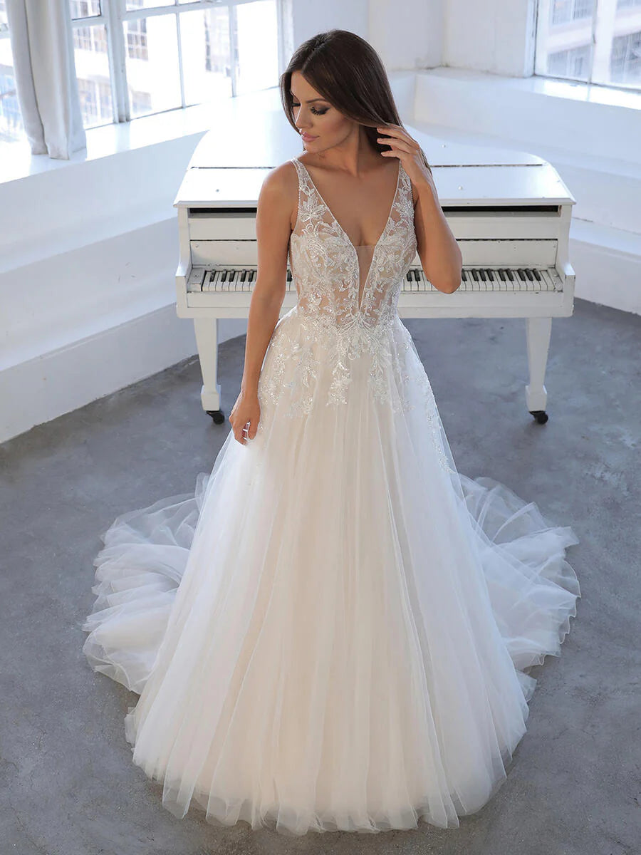Vælger du denne kjole kan du få den med hjem på dagen hvis du ønsker dette. Denne kjole kan ikke bestilles fra ny, og du vil derved købe en prøvemodel fra butikken. Der vil altid være risiko for løse tråde, blonder, perler og minimale huller, der ikke har betydning for kjolens design. Inden kjolen forlader butikken vil vi sammen gennemgå kjolen