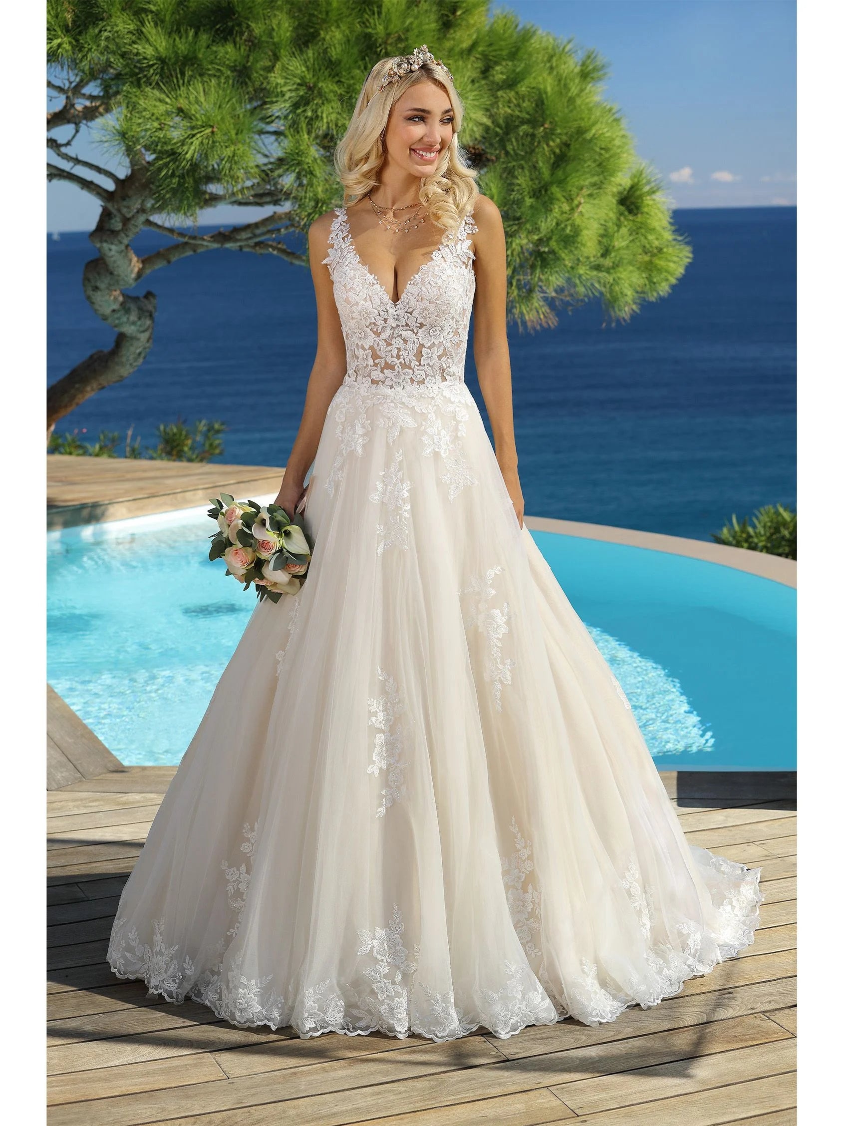 Vælger du denne kjole kan du få den med hjem på dagen hvis du ønsker dette. Denne kjole kan ikke bestilles fra ny, og du vil derved købe en prøvemodel fra butikken. Der vil altid være risiko for løse tråde, blonder, perler og minimale huller, der ikke har betydning for kjolens design. Inden kjolen forlader butikken vil vi sammen gennemgå kjolen
